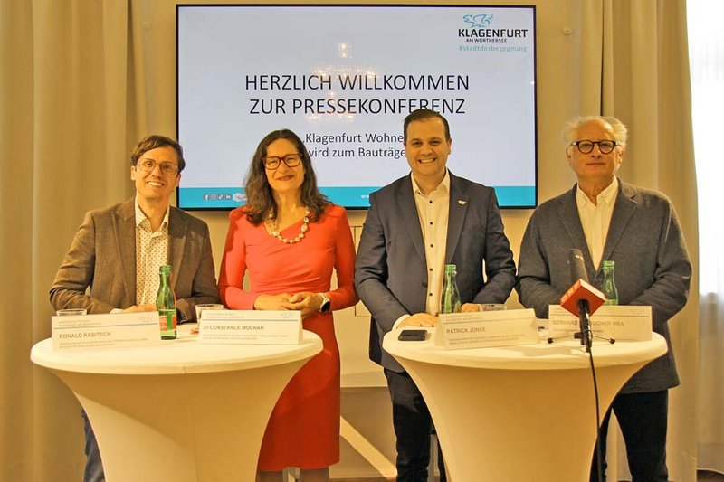 Wohnbaureferent Vizebürgermeister Patrick Jonke, Beteiligungsreferentin Stadträtin DI Constance Mochar und Stadtplanungsreferent Vizebürgermeister Ronald Rabitsch stellten die Pläne gemeinsam mit Gerhard Scheucher, dem Geschäftsführer von „Klagenfurt Wohnen“, vor.
