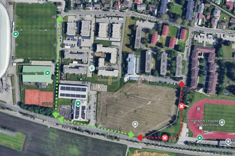 Betroffen ist der Geh- und Radweg zwischen dem Baugrundstück des neuen Bades und der Arena. Aufgrund notwendiger Arbeiten wird der bereits leicht verlegte Weg in Richtung Hubertusstraße von Montag, 20. April, bis längstens Mittwoch, 23. April, gesperrt.