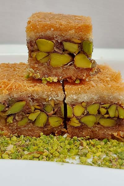 Wir haben uns bei Damascino Sweets, ein von außen eher unscheinbares Geschäft, ein bisserl durchgekostet und waren begeistert vom Geschmack und der Qualität der Produkte. Zucker ist geschmacklich nicht vorherrschend und übertönt auch nicht den Geschmack der einzelnen Zutaten wie Nüsse, Pistazie oder Honig, die man noch gut herausschmecken kann. Auch die Baklava sind nicht so extrem süß wie die Türkischen. Man merkt, die verstehen ihr Handwerk. Auf Vorbestellung gibt es übrigens alle Produkte auch ohne Zucker für Diabetiker.