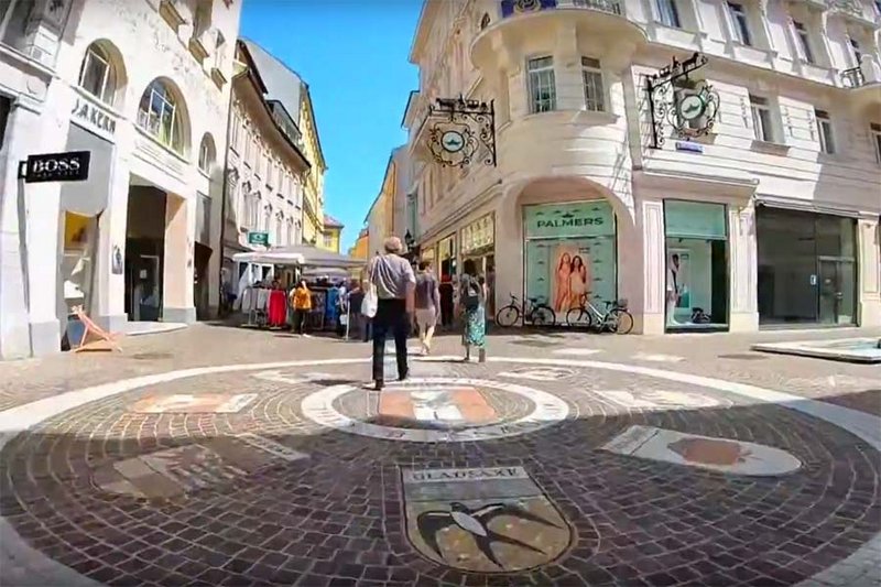 In der Kramergasse sind die Wappen der Klagenfurter Partnerstädte in der Pflasterung verewigt. Dabei fehlen noch die Wappen der Städte der in den vergangenen Monaten geschlossenen Partnerschaften.