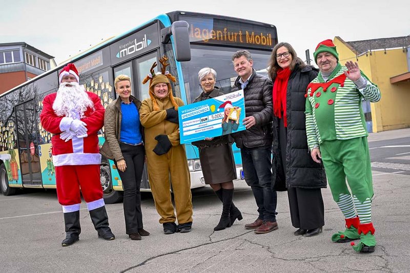 Buslenker Zoran als „Weihnachtsmann“ und Buslenkerin Anja als „Rentier“ sorgten dabei für vorweihnachtliche Stimmung. Insgesamt kamen 2.345,73 Euro an Spenden zusammen. Der Kindergarten Hermagoras/Mohorjeva unterstützte die Aktion zusätzlich mit 115 Euro. Die Stadtwerke Klagenfurt AG stockten den Betrag um 654,27 Euro auf, sodass insgesamt 3.000 Euro übergeben werden konnten.