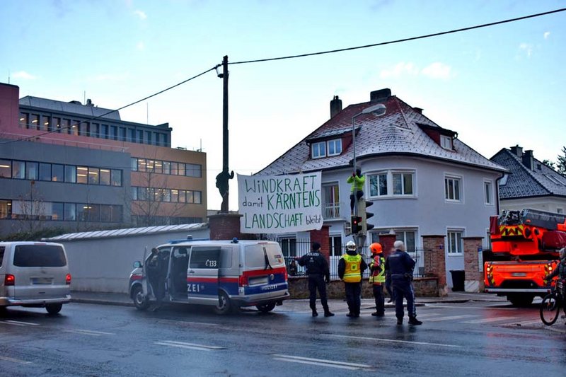 Sie protestieren damit gegen den Versuch, durch die Volksbefragung „Soll zum Schutz der Kärntner Natur (einschließlich des Landschaftsbildes) die Errichtung weiterer Windkraftanlagen auf Bergen und Almen in Kärnten landesgesetzlich verboten werden?“ am 12.1. ein Windkraftverbot für Kärnten zu erzielen. Sie werden wegen Ordnungsstörung angezeigt.