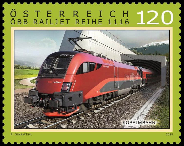 Die Koralmbahn wird am 14. Dezember in Betrieb genommen und wird die schnellste Verbindung zwischen Graz und Klagenfurt sein. Sie ist eines der bedeutendsten Eisenbahninfrastrukturprojekte Europas. Aus diesem Anlass widmet die Österreichische Post das diesjährige Exemplar der beliebten Briefmarkenserie „Eisenbahnen“ der Koralmbahn.