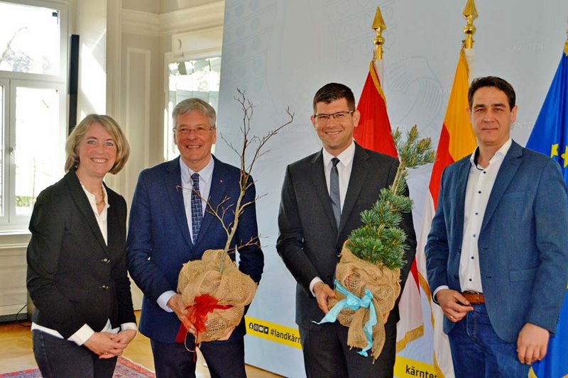 Unterstützung für ein starkes Kapitel zum Thema Klimaschutz haben die Chef-Verhandler der zukünftigen Koalition Landeshauptmann Dr. Peter Kaiser und Landesrat Martin Gruber heute von der überparteilichen Initiative „Mehr Klimaschutz ins Regierungsprogramm“ erhalten. Die 60 Repräsentantinnen und Repräsentanten unterstützen ein umfassendes Programm, mit dem Kärnten seine Klimaziele erreichen und die Energiewende schaffen soll. Das Unterstützungspapier wurde heute in der Kärntner Landesregierung an beide Chef-Verhandler symbolträchtig mit einer Rotbuche und einer Schwarzkiefer als Zeichen für den Klimaschutz übergeben.