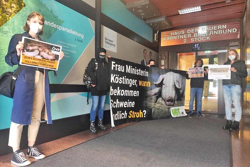 Deshalb protestierten heute Tierschützer:innen in allen 9 Landeshauptstädten jeweils vor den dortigen ÖVP-Zentralen gegen den Vollspaltenboden. Nein, die Schweinehaltung in Österreich ist alles andere als vorbildlich. Nein, die World Animal Protection Society hat sicher nicht festgestellt, dass die Schweinehaltung in Österreich gut sei. Nein, es gab keine Verbesserung der Haltungsbedingungen von Puten im Bundestierschutzgesetz, und deshalb gab es auch keinen Einbruch der Produktionszahlen wegen Tierschutzmaßnahmen. Schluss mit den Propagandalügen! Her mit dem Verbot des Vollspaltenbodens!", so der VGT in einer Aussendung.