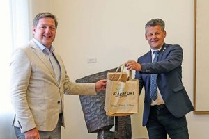 Am Donnerstag stattete Villachs Bürgermeister Günther Albel dem Klagenfurter Bürgermeister Christian Scheider einen Antrittsbesuch im Rathaus ab. Hauptthema war die stärkere Zusammenarbeit der beiden Städte und der umliegenden Gemeinden. Diese wird seit kurzem über den neu gegründeten Verein Zentralraum Kärnten+ organisiert und geleitet. Neben den Bezirksstädten Klagenfurt und Villach umfasst der Zentralraum noch 38 weitere Gemeinden. Gemeinsam kommt man auf mehr als 300.000 Einwohner. „Bürgermeister Albel und ich sind uns einig, dass wir eng zusammenarbeiten werden und Potentiale und Chancen gemeinsam nutzen werden“, erklärte Bürgermeister Scheider nach dem Gespräch. „Wir sind auf einer Ebene, wenn es um die Weiterentwicklung der beiden Städte und ein Denken über Parteigrenzen hinaus geht.“