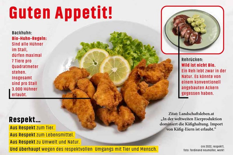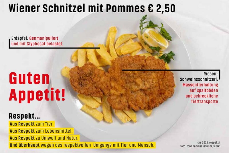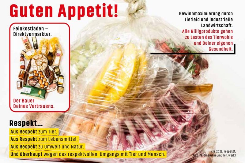 Reinhard Eberharts Kunstpostkarten entstanden aus Respekt zum Tier, aus Respekt zum Lebensmittel, aus Respekt zur Umwelt und Natur und überhaupt wegen dem respektvollen Umgang an sich. "Die Kunstpostkarten-Serie soll uns vor Augen halten, wer wir sind und was wir essen", meint Eberhart, der weiter ausführt: "Billigprodukte gehen zu Lasten von Tierwohl und schaden unserer Gesundheit. Wir essen Gifte, Dioxide, Pestizide, Hormone, Plastikpartikel, Antibiotika resistente Keime und neben vielen anderen Belastungsstoffen zu guter Letzt Stressfleisch durch Tiertransporte sowie deren unwürdige Haltung und grauenvoller Schlachtungen".