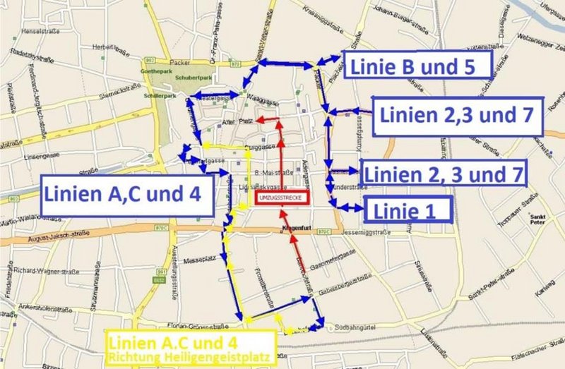 Maßnahmen: Linie B (Welzenegg) und Linie 5 stadtauswärts zum Heuplatz und weiter zur Pischeldorfer Straße, stadteinwärts St. Veiter Ring, Heuplatz zum HGP, Linie 5 über Neuen Platz Südseite zur Haltestelle 14.