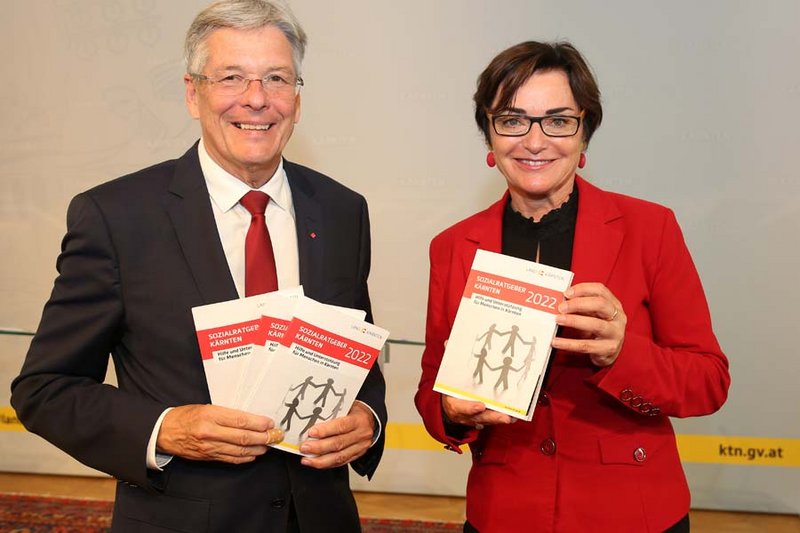 „Wo bekomme ich Hilfe und Unterstützung in schwierigen Bereichen des Lebens?“ – Diese Frage beantwortet der „Sozialratgeber Kärnten 2022“, der heute, Mittwoch, von Landeshauptmann Peter Kaiser und Sozialreferentin LHStv.in Beate Prettner in einer Pressekonferenz vorgestellt wurde. Es handelt sich dabei um eine 200 Seiten starke Broschüre, in der erstmalig alle Unterstützungsleistungen, Maßnahmen, Angebote, Hilfestellungen des Landes Kärnten, des Bundes sowie verschiedener Institutionen und Organisationen übersichtlich aufgelistet sind. 10.000 Stück davon wurden gedruckt und liegen unter anderem beim Land Kärnten sowie demnächst in Gemeinden, Ordinationen, Anwaltschaften, Kammern und Sozialeinrichtungen auf. Wesentlicher Partner beim Sozialratgeber ist „LOTSE Verein zur Förderung der Sichtbarkeit Sozialer Arbeit“, der seit rund einem Jahr auf www.wohin.or.at als kostenfreie Anlaufstelle für Ratsuchende fungiert.