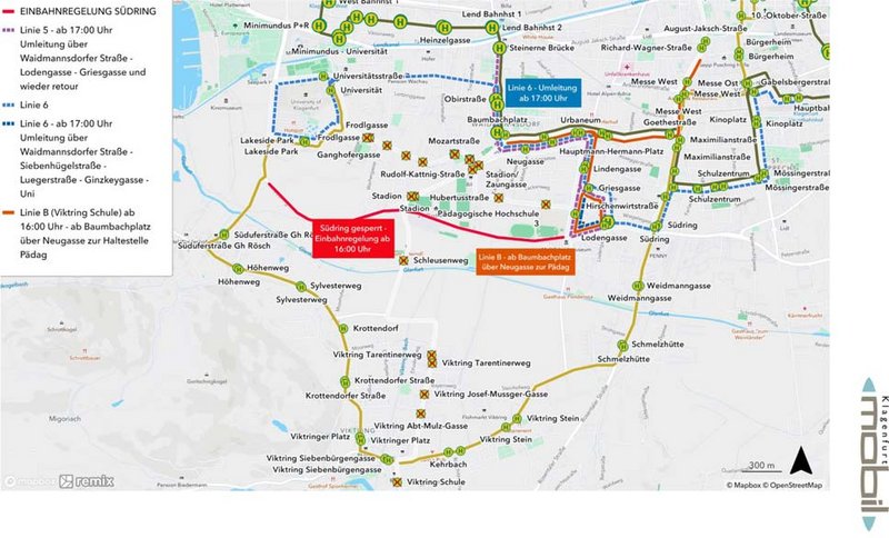 Die Linie B wird ab 16:00 Uhr aufgrund der Sperre kurzgeführt und verkehrt über den Baumbachplatz weiter zur „Pädag“ und von dort wieder linienmäßig retour zum Heiligengeistplatz.