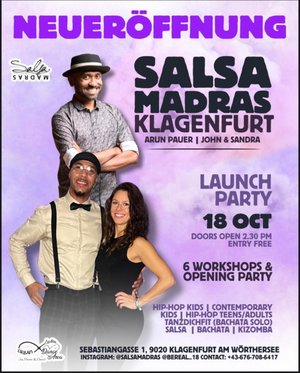 In Klagenfurt entsteht ein neuer Treffpunkt für alle, die gerne tanzen und sich zur Musik bewegen: Am Samstag, 18. Oktober, wird die neue Tanzschule Urban Latin Dance Area gemeinsam mit Salsa Madras Klagenfurt feierlich eröffnet. Die Eröffnungsfeier findet in der Sebastiangasse 1 statt und beginnt um 14.30 Uhr, der Eintritt ist frei.