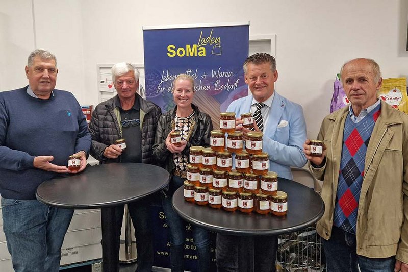 Seit 2013 betreut der Bienenzuchtverein Klagenfurt zehn Bienenstöcke am Kreuzbergl. Ein Teil des jährlichen Ertrages wird dem Sozialmarkt, kurz SOMA, zur Verfügung gestellt. „Eine schöne Geste auch jenen Bürgerinnen und Bürger ein hervorragendes regionales Produkt zur Verfügung zu stellen, die es sich sonst nicht leisten können“, freut sich Sozialreferent Bürgermeister Christian Scheider. Vereinsobmann Albert Goritschnig war heute, Mittwochfrüh, mit seinem Stellvertreter Eduard Lanner und Ferdinand Petschar in den Sozialmarkt gekommen, um SOMA-Leiterin Mag. Theres Leber die Spende zu übergeben.