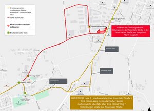 Wegen Bauarbeiten im Kreuzungsbereich Rosentaler Straße/Keutschacher Straße wird die KMG Linie 8 an folgenden Terminen umgeleitet: