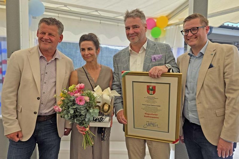„Die ‚Feine Küche Kulterer’ ist ein Aushängeschild für Kärntner Kulinarik und in ganz Klagenfurt und darüber hinaus bekannt. Es scheint daher mehr als angemessen, dem Unternehmen aus Anlass des 50-jährigen Bestehens das Recht zur Führung des Klagenfurter Stadtwappens zu verleihen”, so Bürgermeister Christian Scheider anlässlich der Verleihung. „Möge das Stadtwappen fortan als Symbol für Exzellenz, Verantwortung und Gemeinschaft in Klagenfurt stehen – Eigenschaften, auf die wir alle stolz sein können“, so der Bürgermeister, der die Auszeichnung im Namen der Landeshauptstadt Klagenfurt gemeinsam mit Stadträtin DI Constance Mochar und Stadtrat Julian Geier verliehen hat.