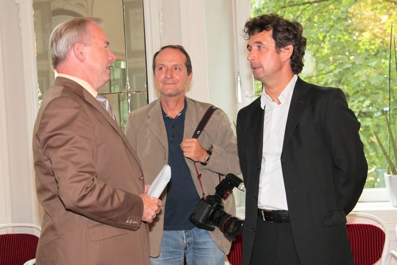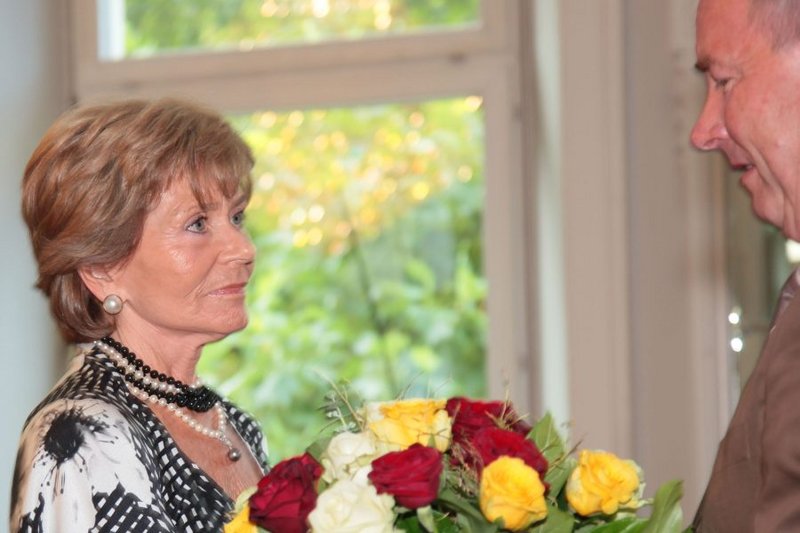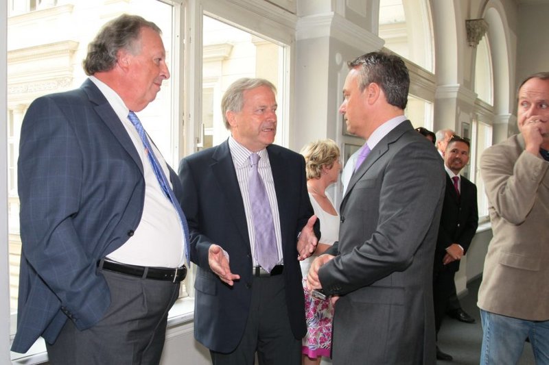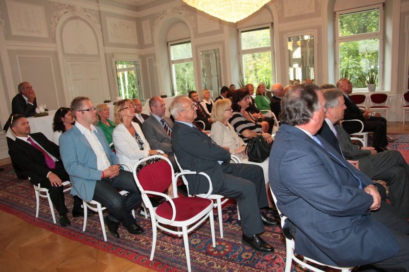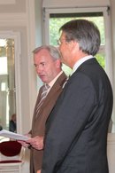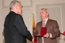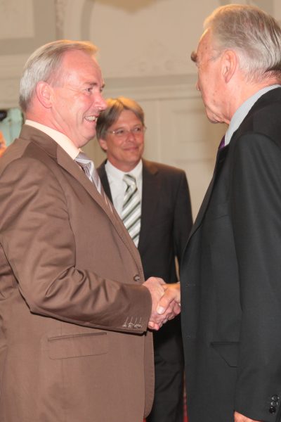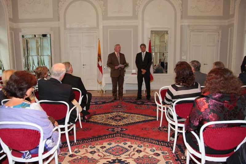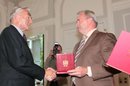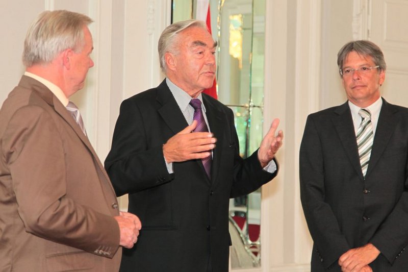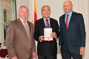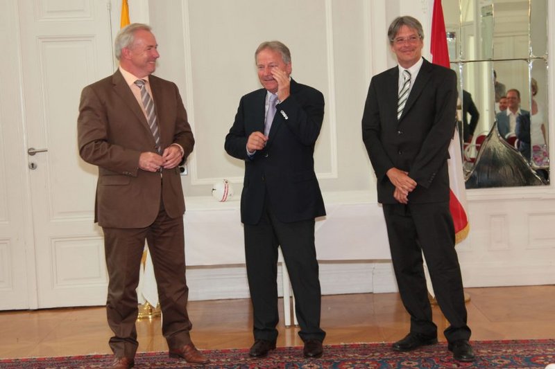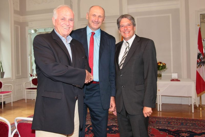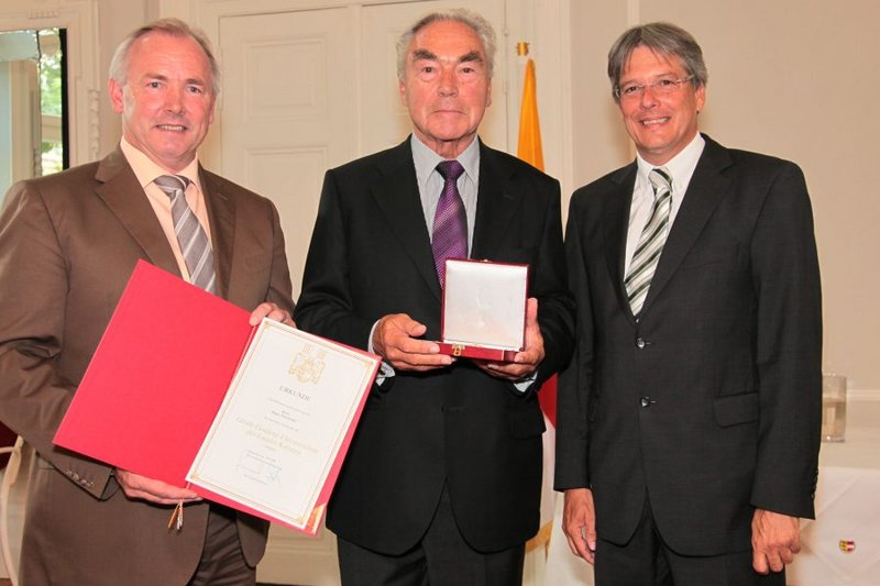 LH Dörfler und LR Kaiser verliehen dem früheren ÖFB-Präsidenten Beppo Mauhart im Spiegelsaal der Kärntner Landesregierung das "Große Goldene Ehrenzeichen des Landes Kärnten".