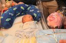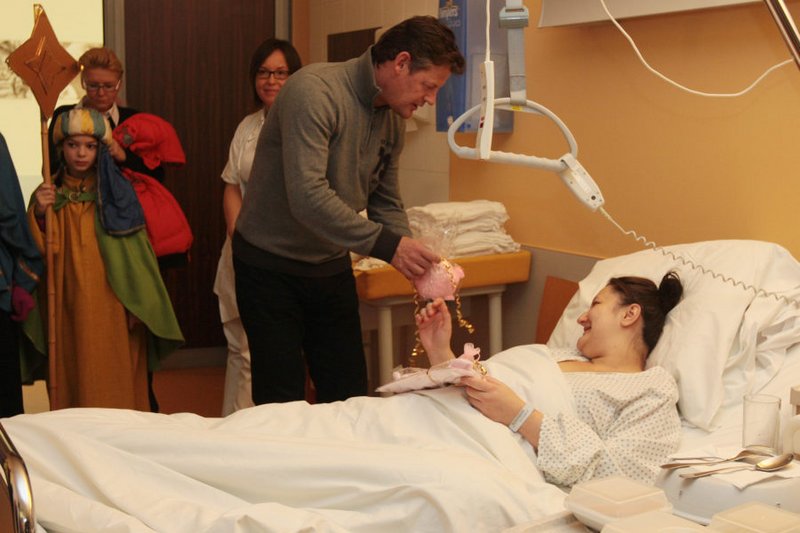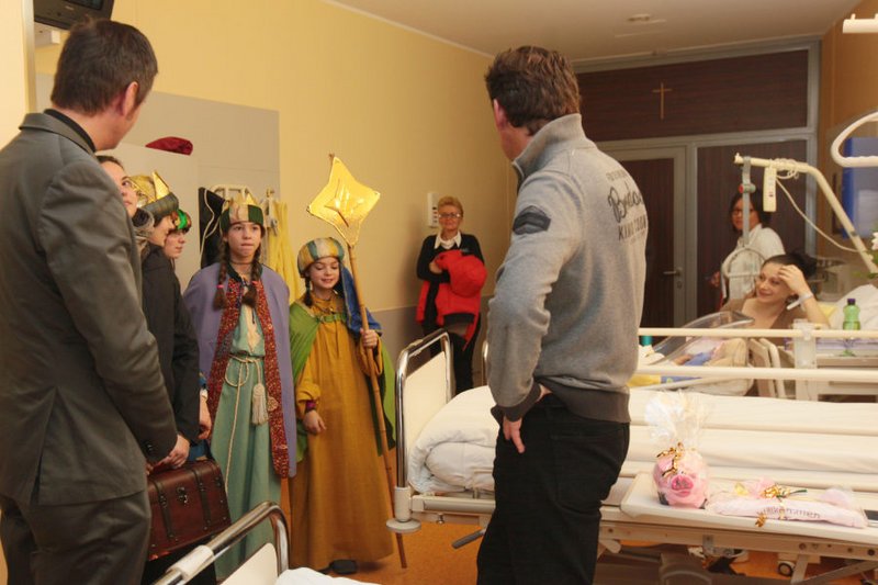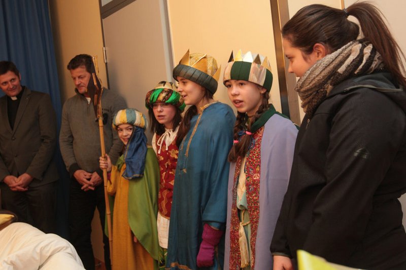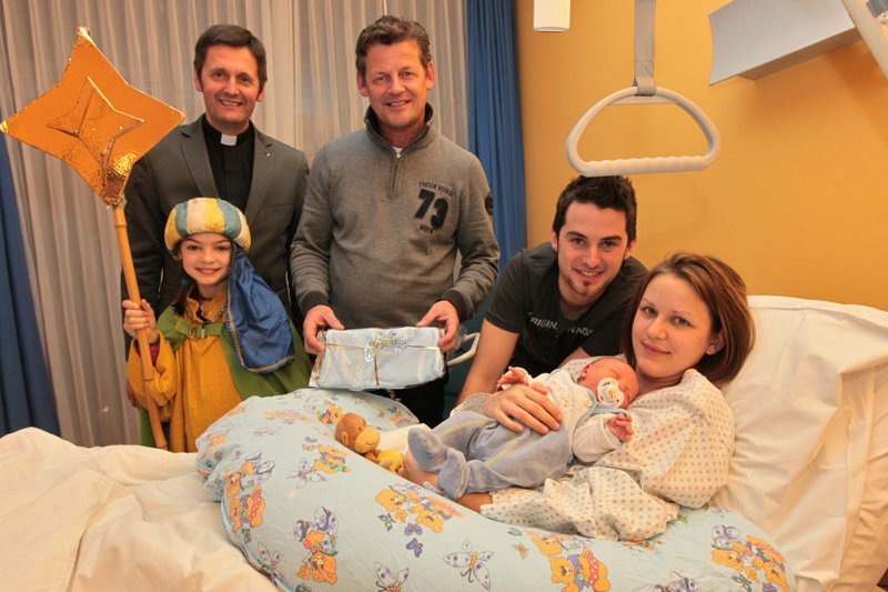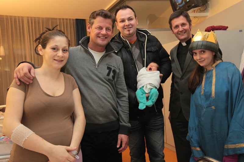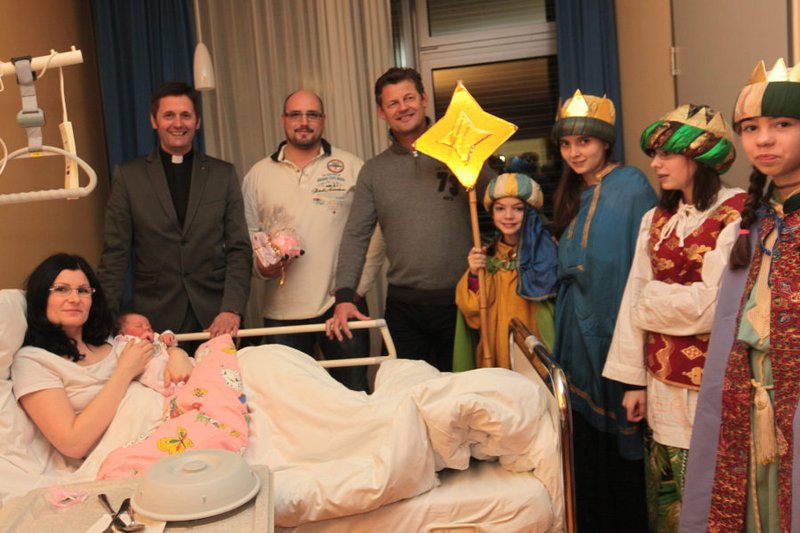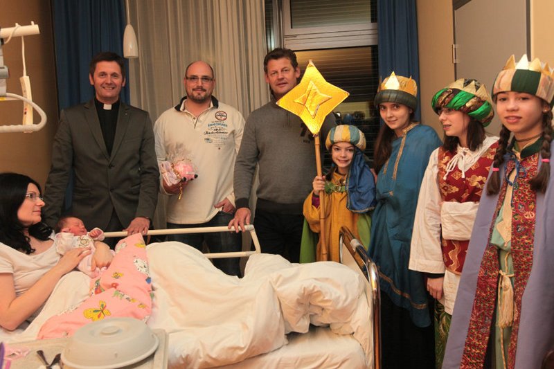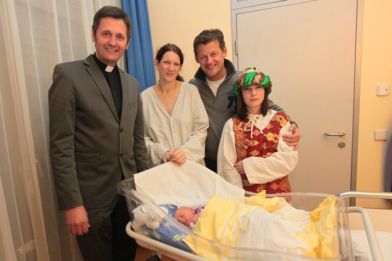 Bürgermeister Christian Scheider besuchte mit Dompfarrer Dr. Peter Allmaier und den Sternsingern die Klagenfurter Neujahrsbabies im ELKI.