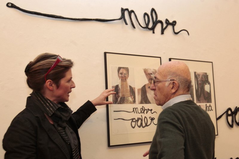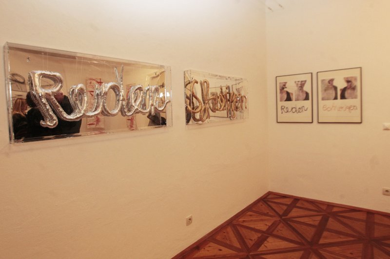 In der Ausstellung "...mit Text" von Ina Loitzl und Regina Hadraba werden alte Texte von Ingeborg Bachmann neu interpretiert. Auch wird Kritik an der Oberflächlichkeit, sowie an der gängigen Methode, Menschen mit Geld unter Druck zu setzen und zum Schweigen zu bringen, zum Ausdruck gebracht.