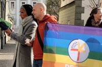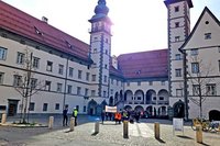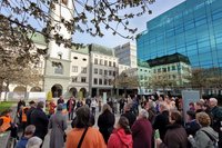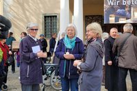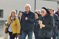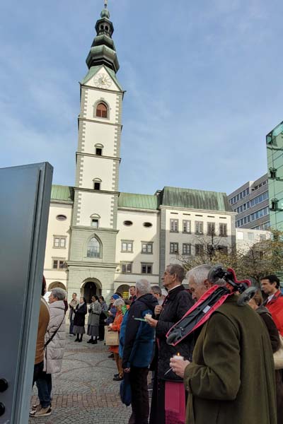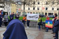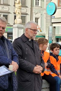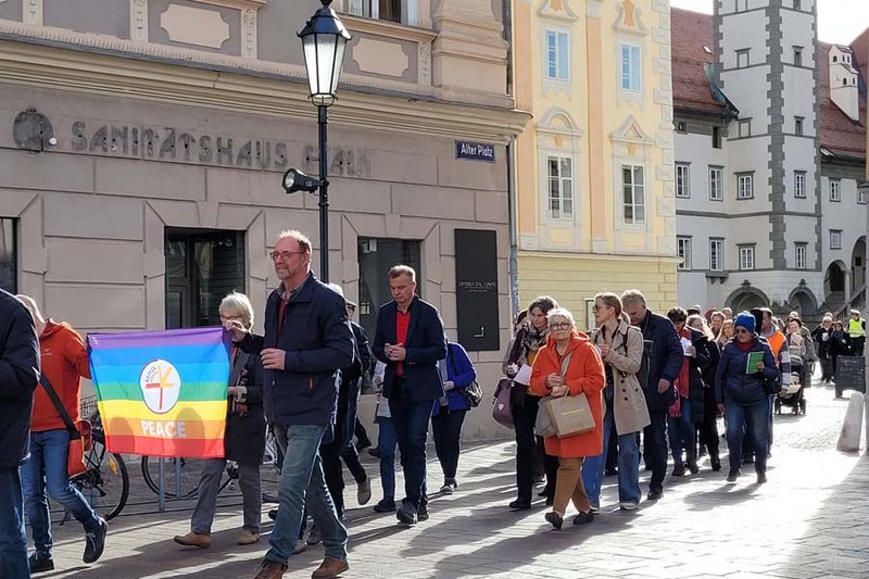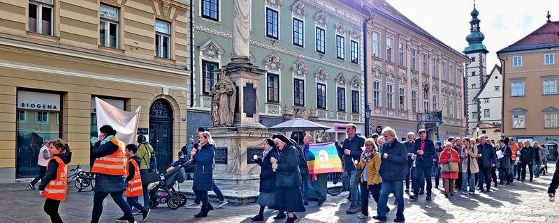 Der Zug startete am Heiligengeistplatz und zog über den Landhaushof auf den Alten Platz, durch die Kramergasse, Neuer Platz bis zum Domplatz, wo gemeinsam für den Frieden in der Welt gebetet wurde.