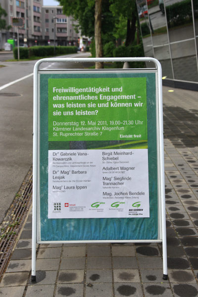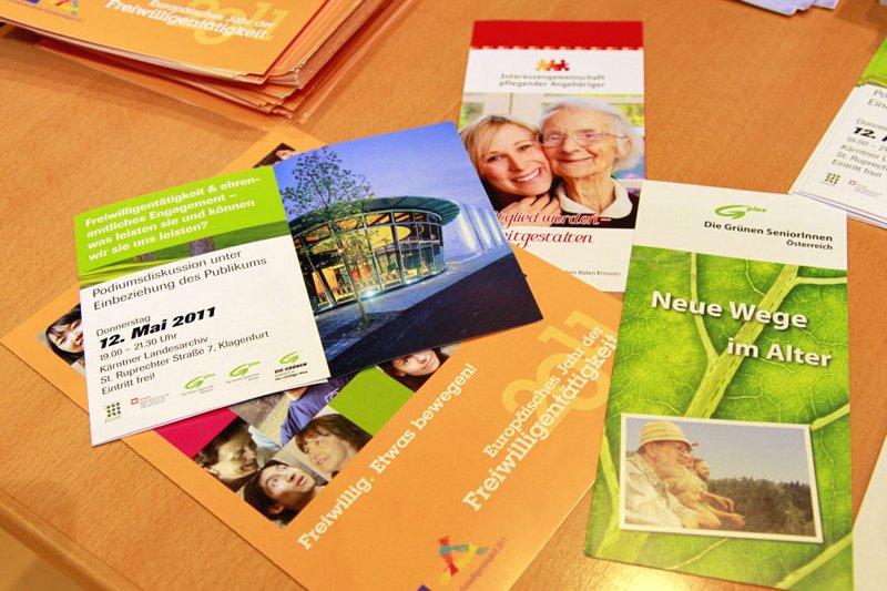 Unter Einbeziehung des Publikums initiierten die Grünen SeniorInnen Kärnten, in Kooperation mit der Grünen Bildungswerkstatt Kärnten sowie den Grünen Kärnten, eine Podiumsdiskussion im Kärntner Landesarchiv zum Thema "Freiwilligentätigkeit und ehrenamtliches Engagement" zum Jahr der Freiwilligkeit und des Ehrenamtes.