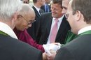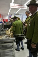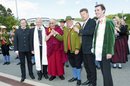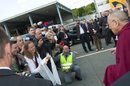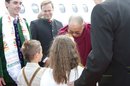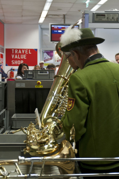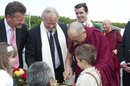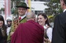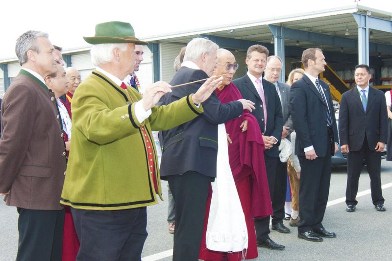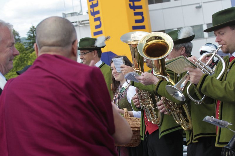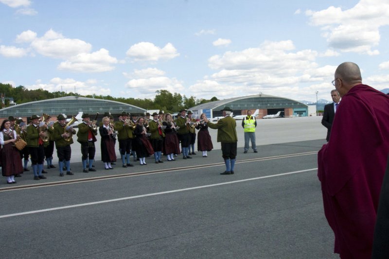 Viel Humor zeigte der Dalai Lama bei seiner Ankunft am Flughafen Klagenfurt gegenüber den wartenden Journalisten und der Stadtkapelle Feldkirchen, wo er zur Überraschung aller den Dirigentenstab in die Hand nahm und gleich zu dirigieren begann.