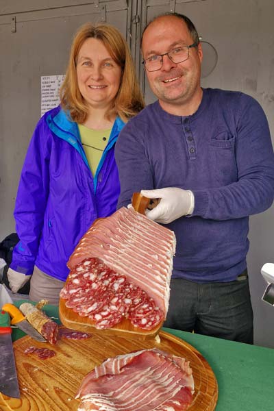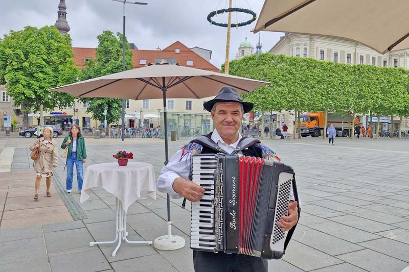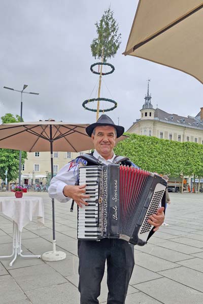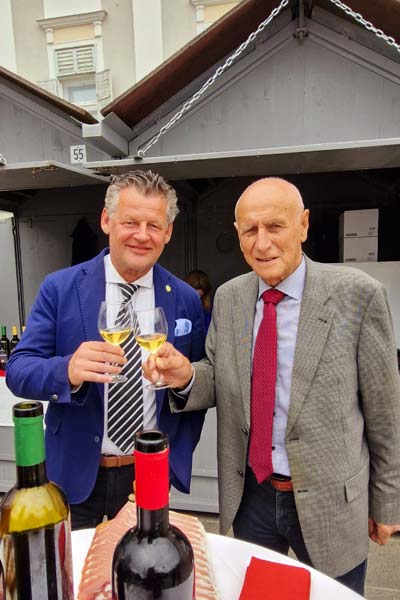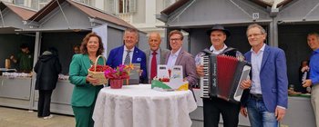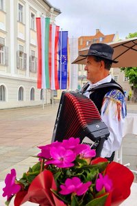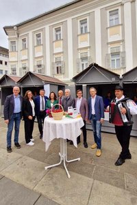 Bürgermeister Christian Scheider und Vizebürgermeister Ronald Rabitsch begrüßten die Delegation rund um Bürgermeister Franc Mužic und Anita Manfreda (Direktorin der Obcina Brda) mit Musikern und Kirschhändlern vor dem Rathaus.