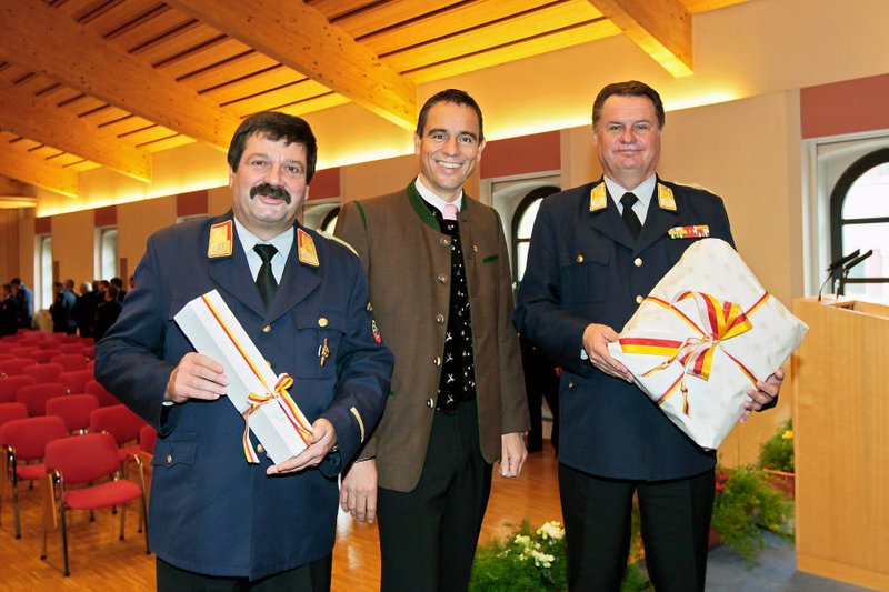 LHStv. Uwe Scheuch gratuliert Josef Meschik und seinem Stellvertreter Hugo Irrasch zur Wiederwahl als Landesfeuerwehrkommandant von Kärnten.