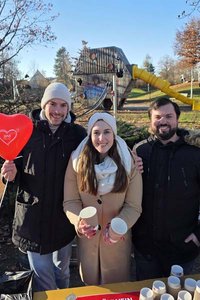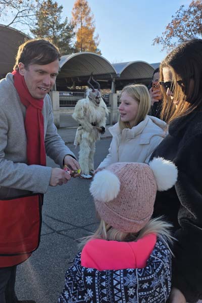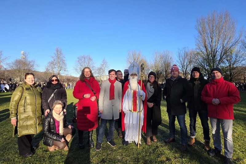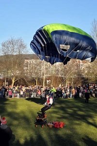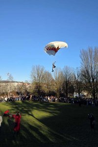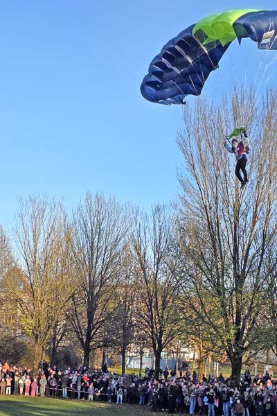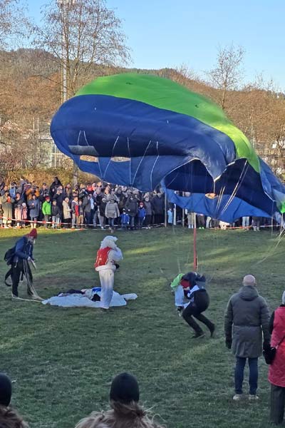 Über dem Welzenegger Park sprangen gleich zwei Nikoläuse aus einem Flugzeug, wo sie schon von Tausenden erwartet wurden. Nach der Landung stürmten alle in Richtung der gelandeten Nikoläuse, die anschließend Süßigkeiten und Nikolosackerln verteilten.